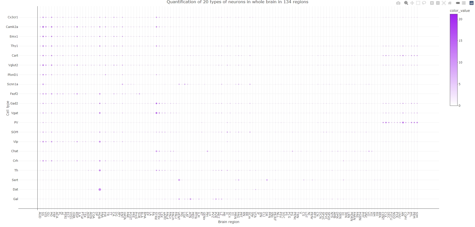 Cell quantification of 20 molecularly defined types in whole brain, divided in 134 brain regions.