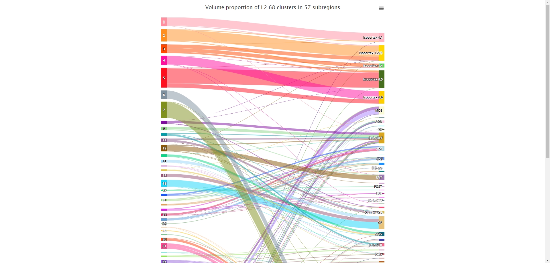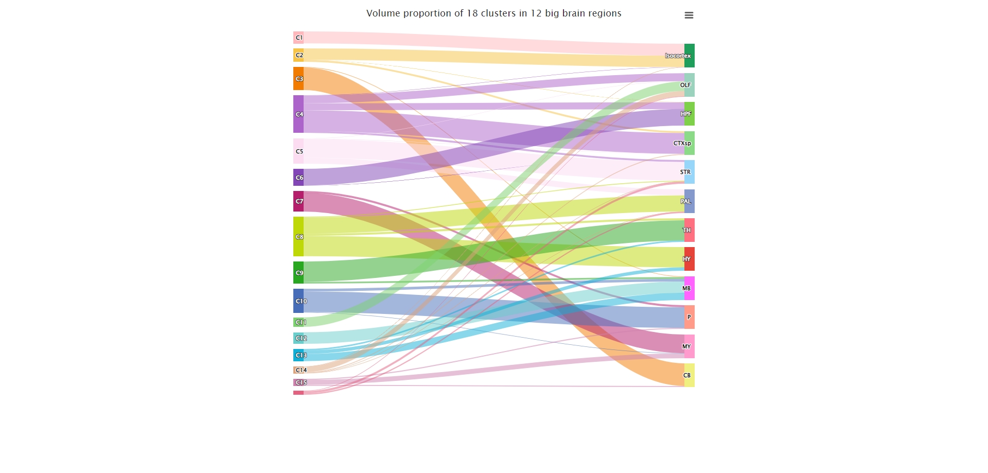 Sankey plot of the proportion of three-dimensional grid volumes belonging to different clusters in each brain region in unsupervised clustering of the whole brain.